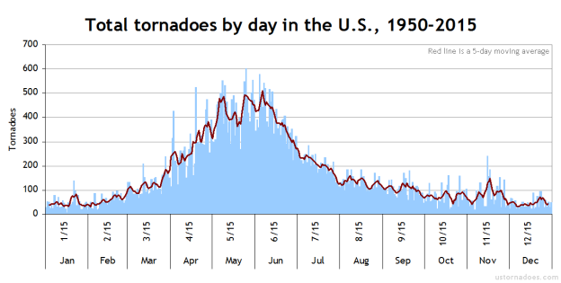 Now that Spring is well underway, and we are well into our annual “severe weather” season over much of the central and eastern parts of the United States. I thought I’d devote this month to all aspects relating to spring severe weather in the United States, including thunderstorms, lightning, hail and of course, tornadoes! Figure 1 below shows the total tornadoes by day between 1950 and 2015, with May 25th as the most active tornado day on average in the United States.