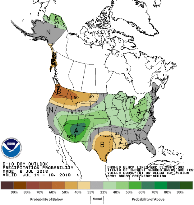 Figures 5 and 6 below show the expected 6-10-day temperature and precipitation outlooks. The colored shading on the map indicates the degree of confidence the forecaster has in the category indicated, where "B" and blue colors indicate "below-normal" and "A" and orange-red colors indicate "above normal". The darker the shading, the greater is the level of confidence. The numbers labeling the contours separating different shades gives the probability that the indicated category (A, B, or N) will occur.