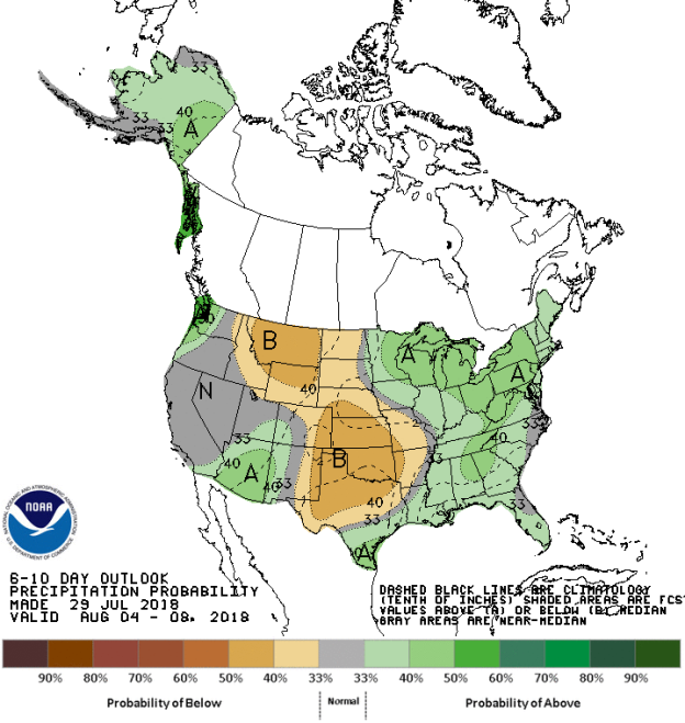 Figures 5 and 6 below show the expected 6-10-day temperature and precipitation outlooks. The colored shading on the map indicates the degree of confidence the forecaster has in the category indicated, where "B" and blue colors indicate "below-normal" and "A" and orange-red colors indicate "above normal". The darker the shading, the greater is the level of confidence. The numbers labeling the contours separating different shades gives the probability that the indicated category (A, B, or N) will occur.