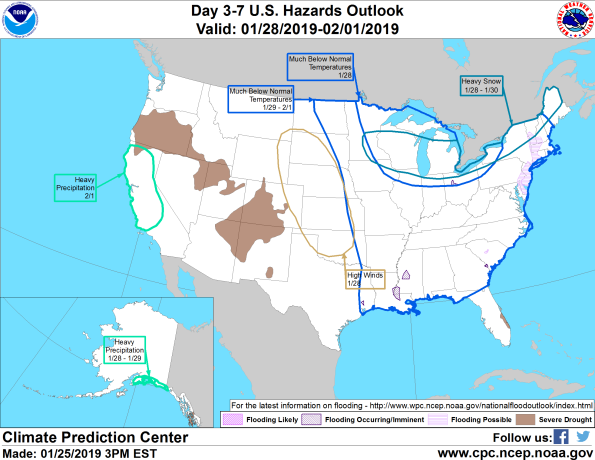 Weekly hazards output by the NWS’s Climate prediction center for the next 3-7 days is shown in Figure 11 below.
