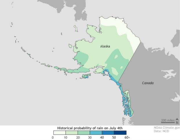 Alaska has also historically had a widespread in the chance of rain on July 4th, with chances on the North Slope of 10 percent or less and chances in coastal, Southeast Alaska of between 30-40 percent as seen in Figure 4 below: